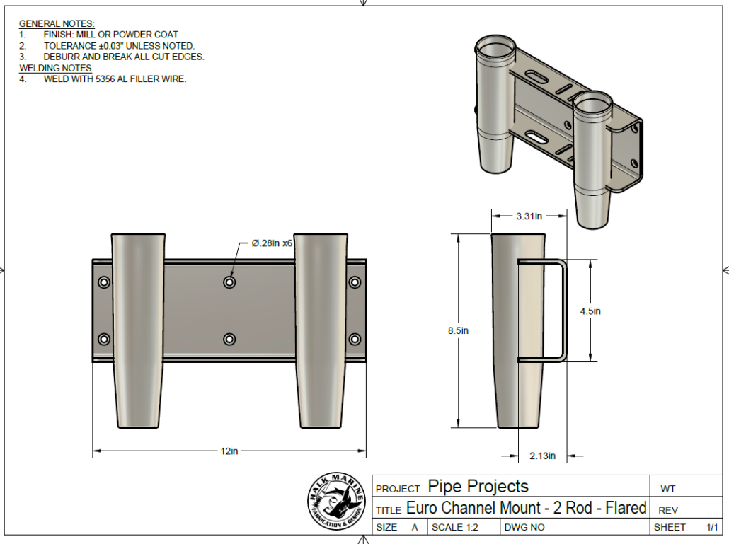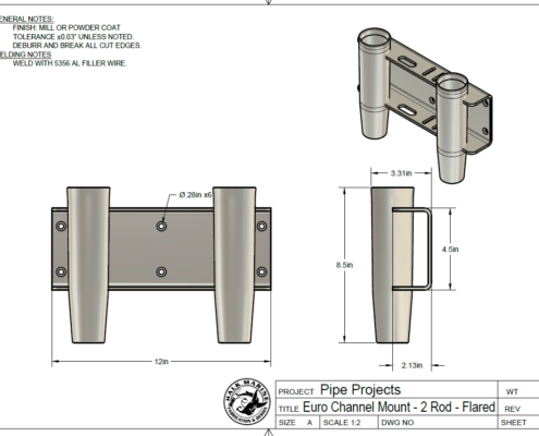Our unique low-profile channel style rod holder mount is perfect for mounting along your boat center console, transom, or other vertical surfaces. The channel is CNC machined and formed to accept either 8.5″ flared rod holders or 8.5″ spinning rod holders. It also features multiple pockets for holding fillet knives and pliers.